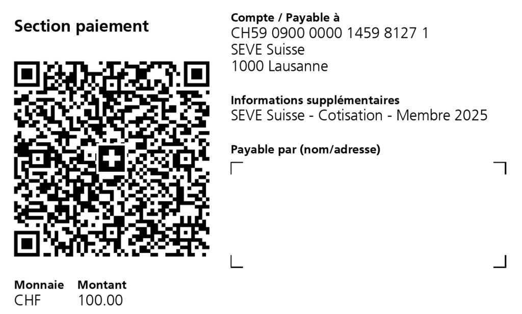 Afin de devenir membre de SEVE Suisse, veuillez remplir le formulaire ci-dessous et verser la somme de CHF 100.- sur le compte de l’Association :